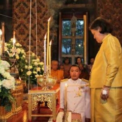 | - เสด็จ ฯ ไปยังหน้าฐานชุกชี ทรงเจิมเทียนพระมหามงคลทอง เงิน เทียนวิปัสสี | |